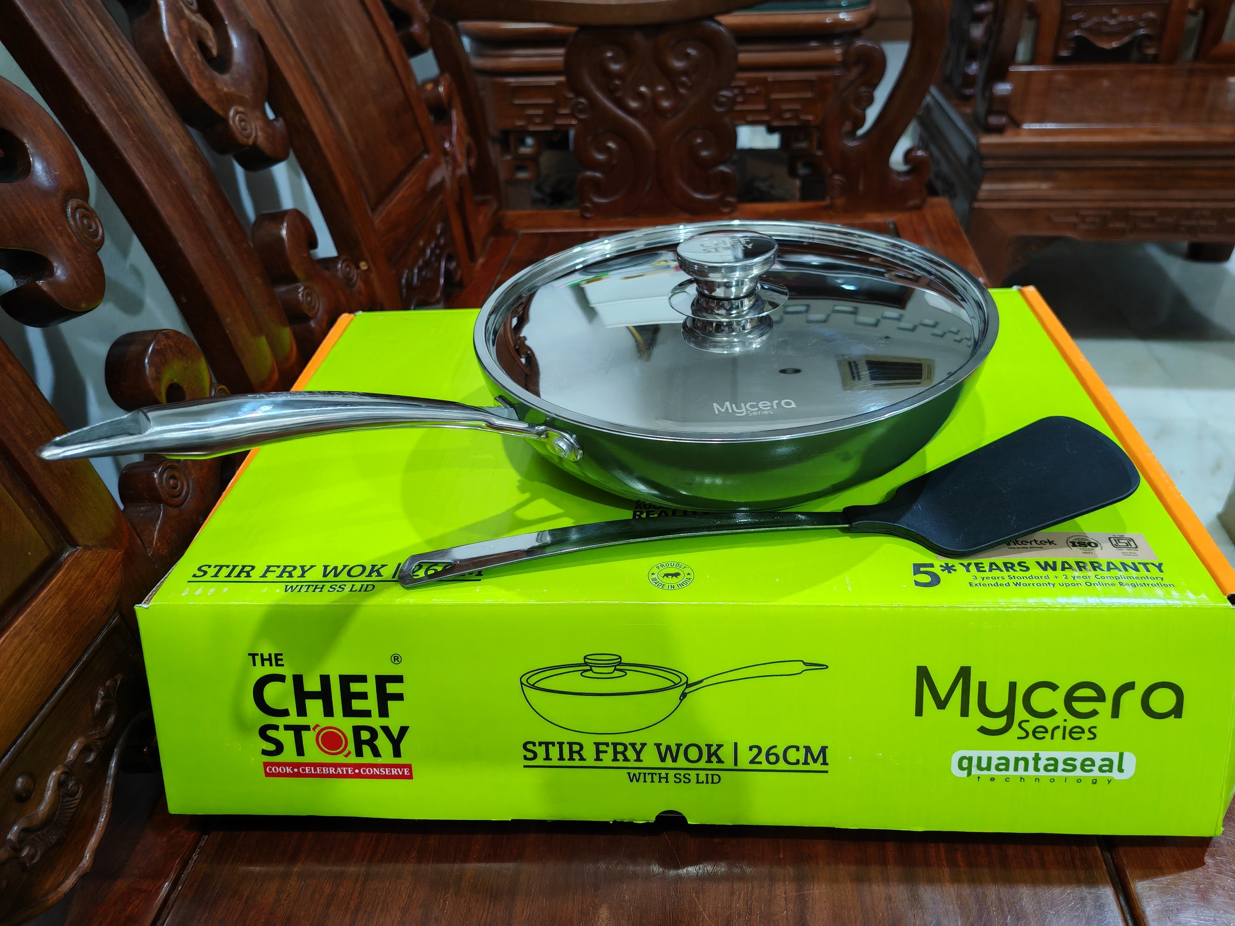 Very nice looking wok, beautiful shiny green, solid, a bit heavy, reasonable price.