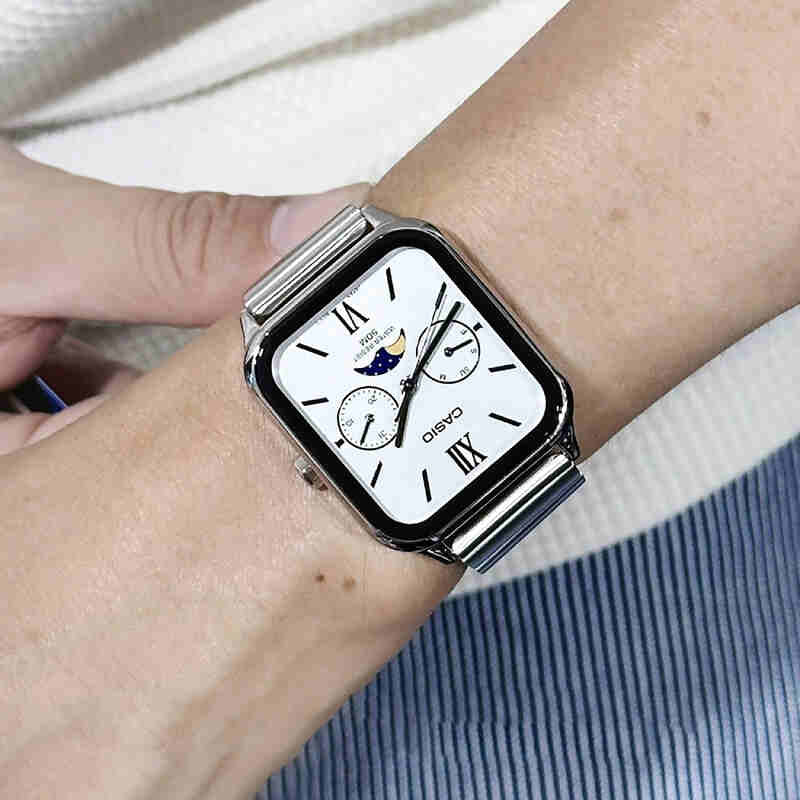 - Analog: 3 hands (hour, minute, second), 3 dials (date, day, moon phase)