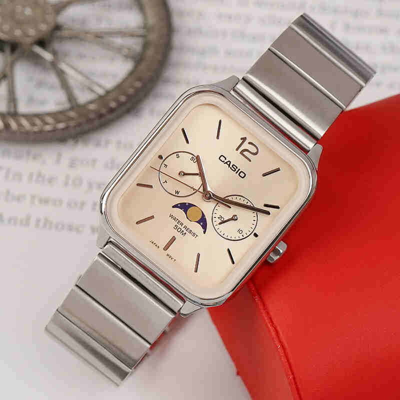 - Analog: 3 hands (hour, minute, second), 3 dials (date, day, moon phase)