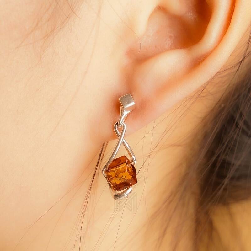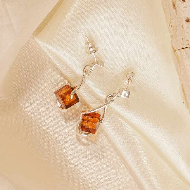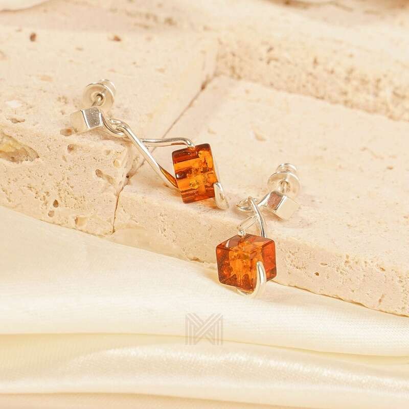 MILLENNE Multifaceted Baltic Amber Cuboid Silver Earrings with 925 Sterling Silver
