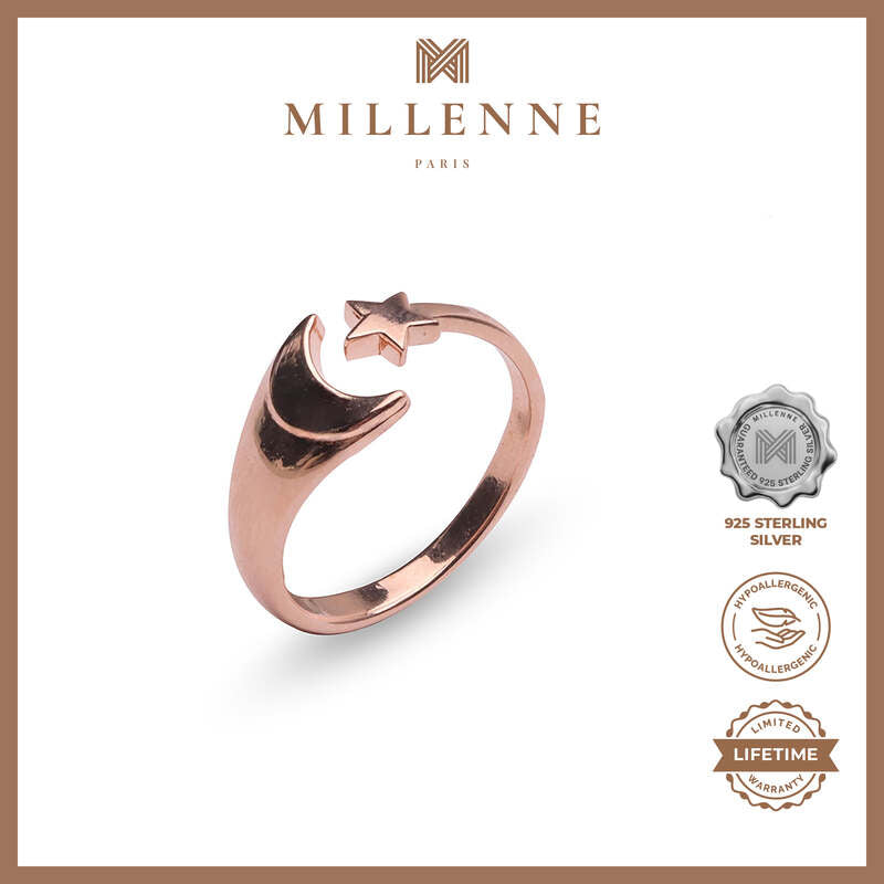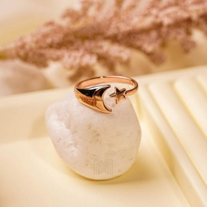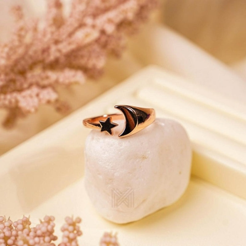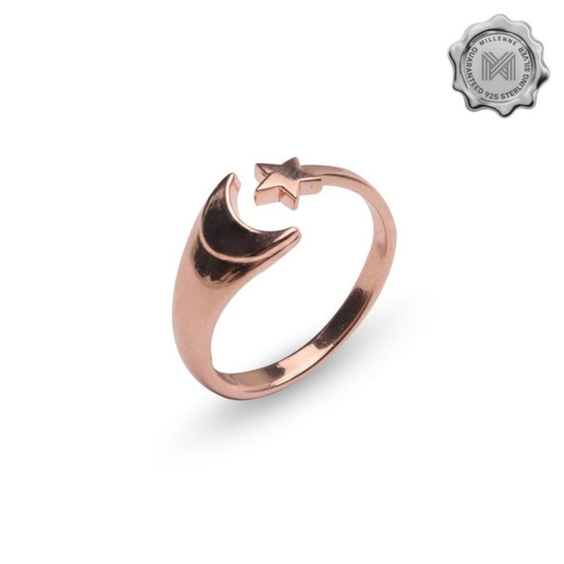 MILLENNE Match The Stars Cresent Moon and Star Rose Gold Adjustable Ring with 925 Sterling Silver