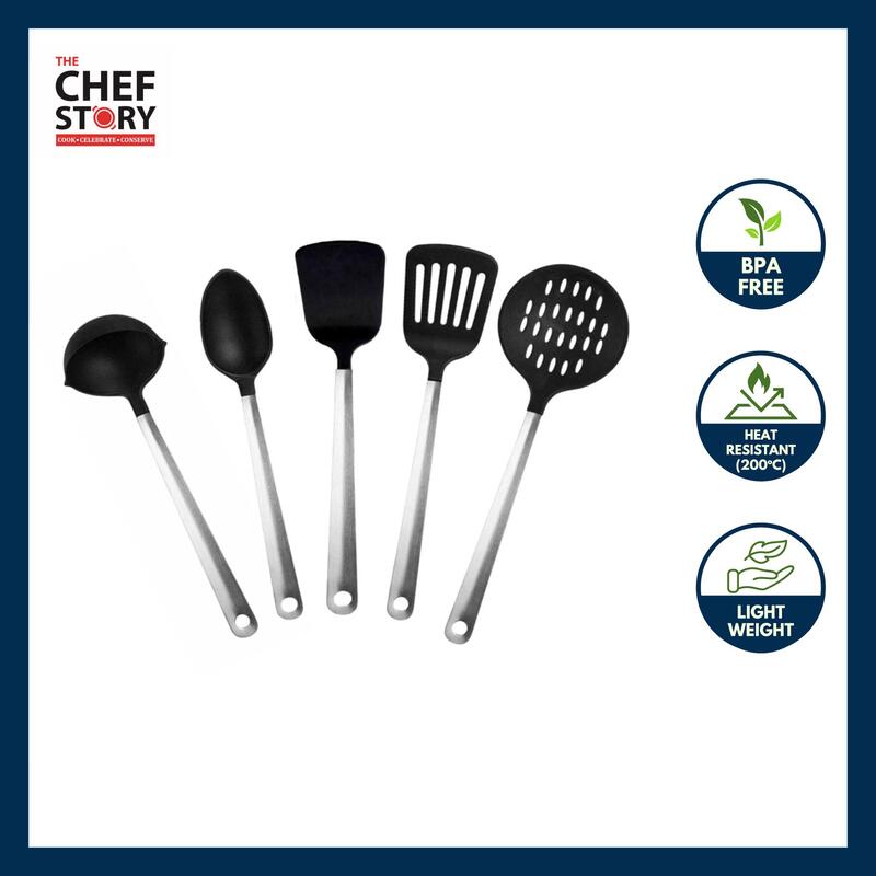 The Chef Story Everyday Series 5-Piece Nylon Kitchen Utensil Set | Ladle, Turner, Spoon, Spatula & Skimmer