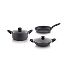 - Set includes: 26 cm Fry Pan, 26 cm Wok with Lid, 26 cm Casserole Pot with Lid.