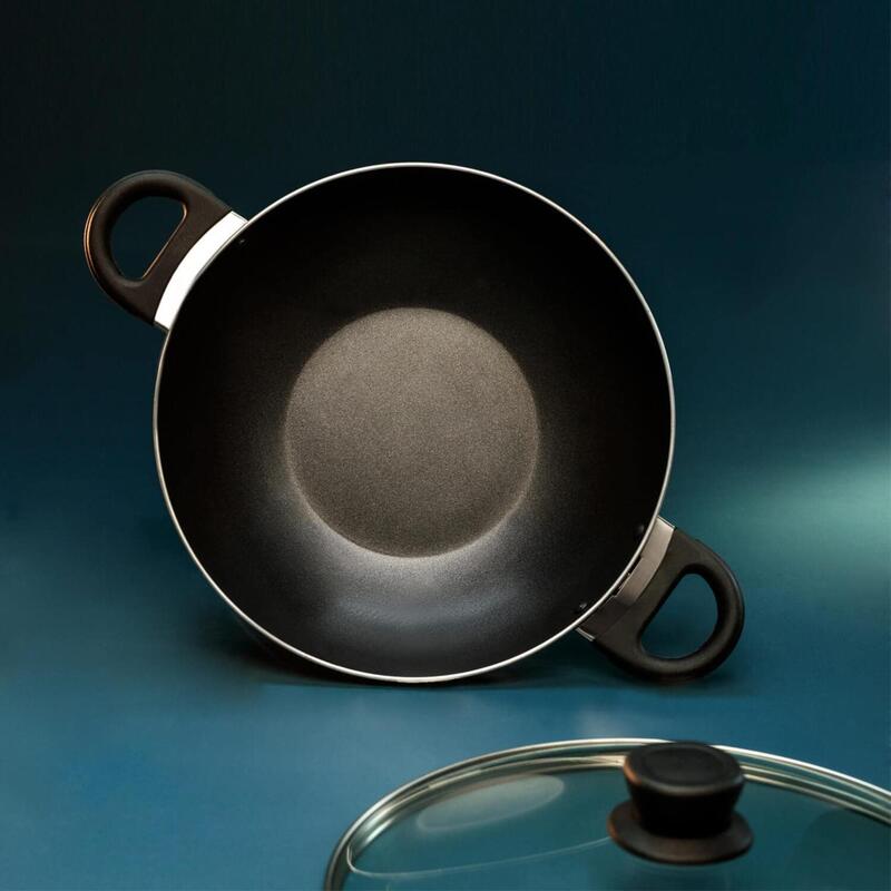 - Finished in elegant black, this wok adds a sleek and modern touch to your cookware collection.