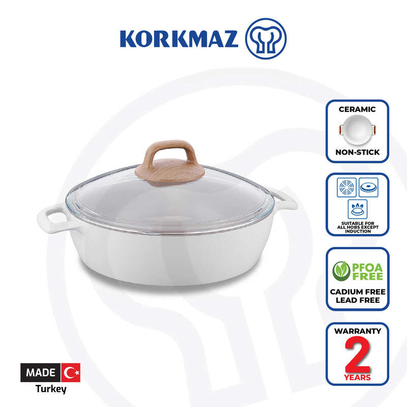 Korkmaz Gusto Non Stick Ceramic Cooking Pot with Glass Lid - 26x7cm, Gas Stove Compatible, Made In Turkey