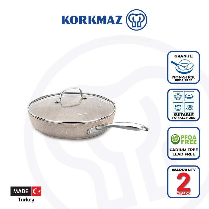 Korkmaz Granita Non Stick Frying Pan With Glass Lid - PFOA Free, Induction Compatible, Made In Turkey